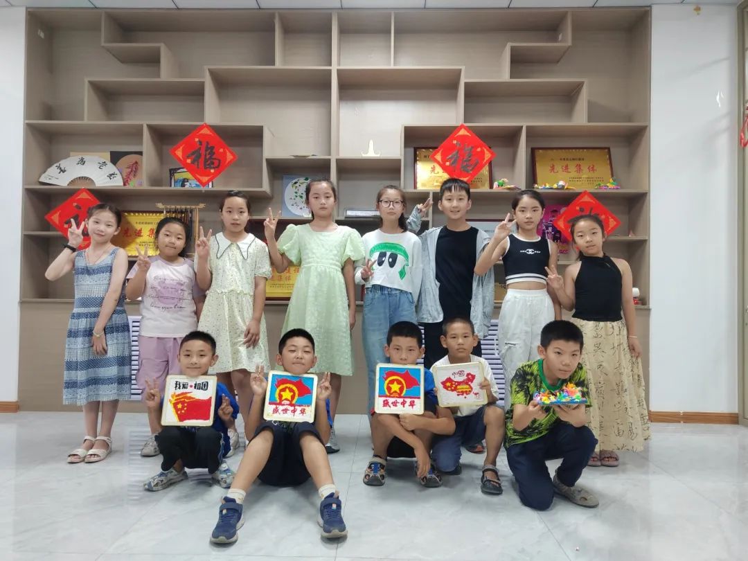 纸浆画是以纸浆为主要材料创作的艺术作品,它可以在卡纸、纸浆画盘、废纸壳等各种材料上进行绘制,自然风干后可成为一件精美的艺术品。纸浆画颜色鲜艳,纸浆质地柔软,安全无毒,可塑性强,由于它的制作过程并不复杂,原始材料也随处可见,艺术效果强烈,所以深得孩子们的喜爱,制作过程也充满童真童趣。通过纸浆画的制作,幼儿的手、脚、脑、眼间的协调性可以得到充分锻炼。“童心守护,关爱相伴”暑期“三下乡”社会实践队和“育”美“童”行实践队走进滨河路社区为小朋友们开展了儿童纸浆画的美育教育活动。 社区小朋友以小组为单位,在“育”美“童”行实践队志愿者老师的指导下用小镊子镊住调好颜色的纸浆,在已经打好底稿的画盘或者纸板上开始进行点色,采取点铺的方法进行铺色。此次儿童纸浆画都是爱国主义题材,以加强小朋友的爱国主义情感,激发小朋友爱国主义的热情,引导他们与时代同向,与祖国同行。经过团队的合作努力,填充好所有色浆之后,作品就基本完成了,再放到阴凉处自然风干,这样一幅漂亮的独具风格的纸浆画就完成了,小朋友们都说有满满的成就感!