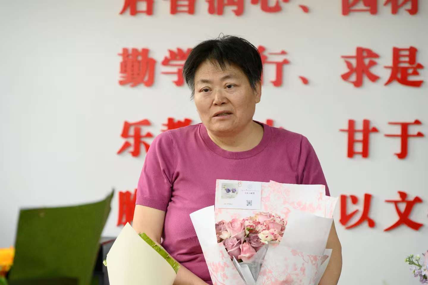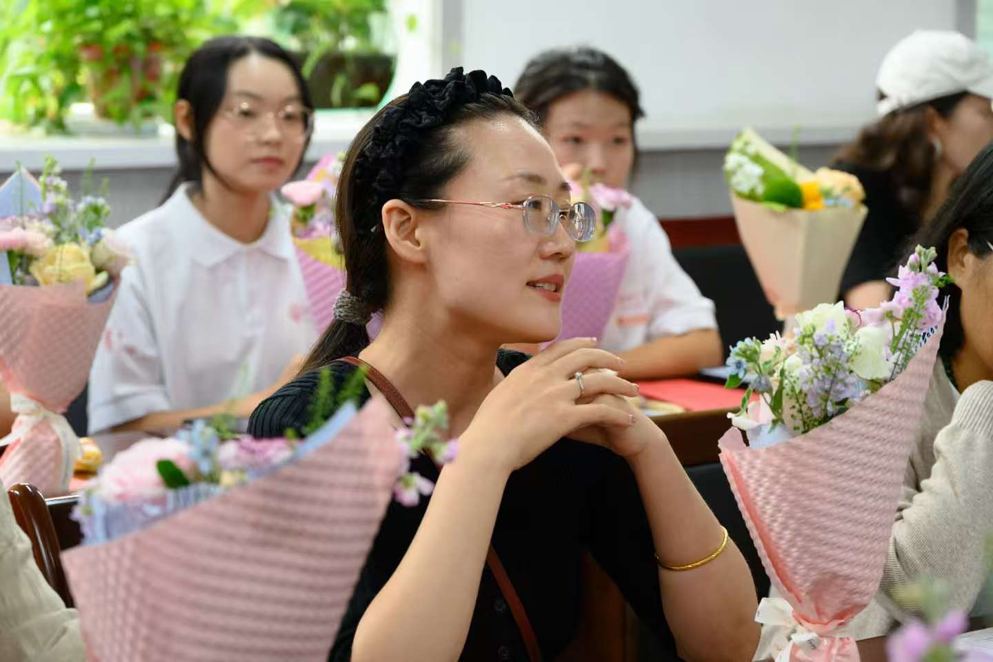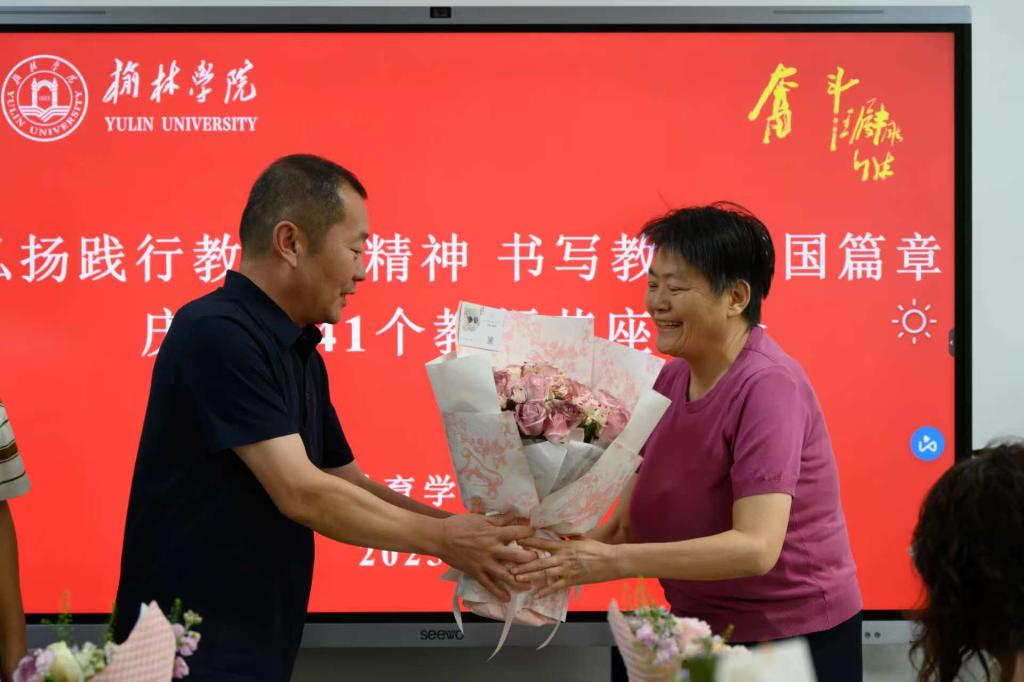 白炜院长和加楠副书记为四有好老师刘东梅和30年教龄的老教师姬小婷、方卓君亲手赠送鲜花。馥郁的花香里,既承载着对老教师数十年深耕教坛、坚守奉献的敬意,也饱含着对优秀教师深耕育人、勇创佳绩的肯定,瞬间让现场暖意更浓。