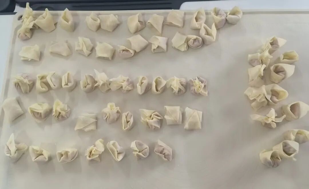 掌握基础技法后,同学们以小组为单位分工协作,正式开启首趟“烹饪之旅”。起初,不少同学动作略显生疏,有的馅料放多了捏不紧,有的褶皱捏得不够整齐,但大家并未气馁,而是互相请教、反复练习。随着时间推移,指尖的动作愈发娴熟,一个个形态规整、饱满可爱的馄饨逐渐堆满托盘。当看到自己亲手包的馄饨整齐排列时,同学们脸上都洋溢着满满的成就感,实训场地内笑声、讨论声此起彼伏,热闹而温馨。